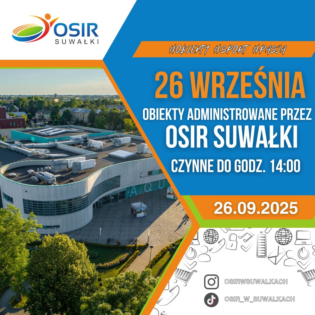 W dniu 26 września br. wszystkie obiekty administrowane przez Ośrodek Sportu i Rekreacji będą czynne do godz. 14:00!