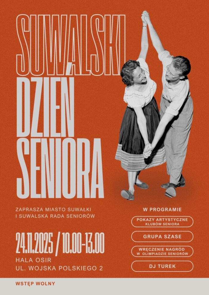 Na Suwalski Dzień Seniora w poniedziałek 24 listopada w godzinach 10:00 – 13:00 do hali sportowej OSiR przy ul. Wojska Polskiego 2 zapraszają Miasto Suwałki i Suwalska Rada Seniorów.